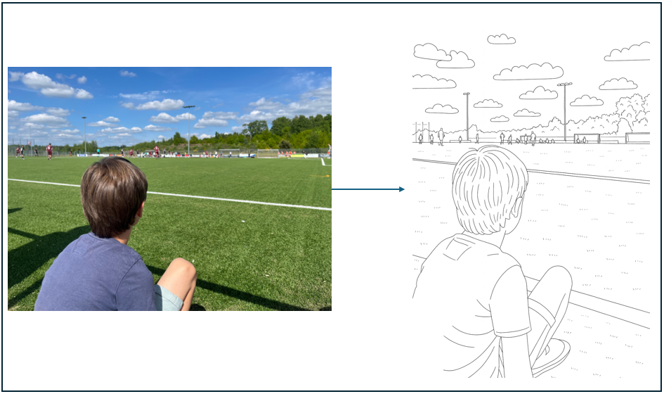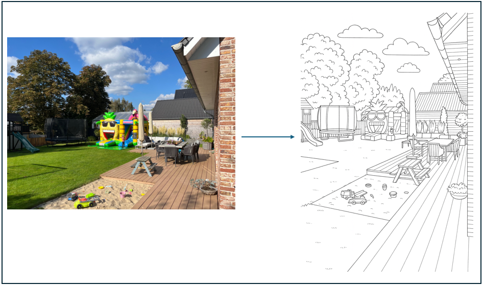 Beispiel 1: Ein Foto deines Kindes beim Spielen im Garten wird zur individuellen Ausmalseite. Perfekt als Erinnerung, Beschäftigungsidee oder kleines Geschenk für Oma und Opa.