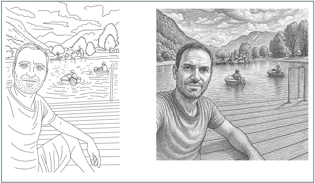 Du schickst dein Wunschfoto per E-Mail an info@ausmalbild-profis.de. Innerhalb von 48 Stunden erhältst du dein Bild als Ausmalvorlage zurück – auf Wunsch sogar in zwei Varianten: einmal als einfaches Ausmalbild mit klaren Linien und größeren Flächen, und einmal als detaillierte Version mit mehr Feinheiten für kleine und große Ausmalkünstler.