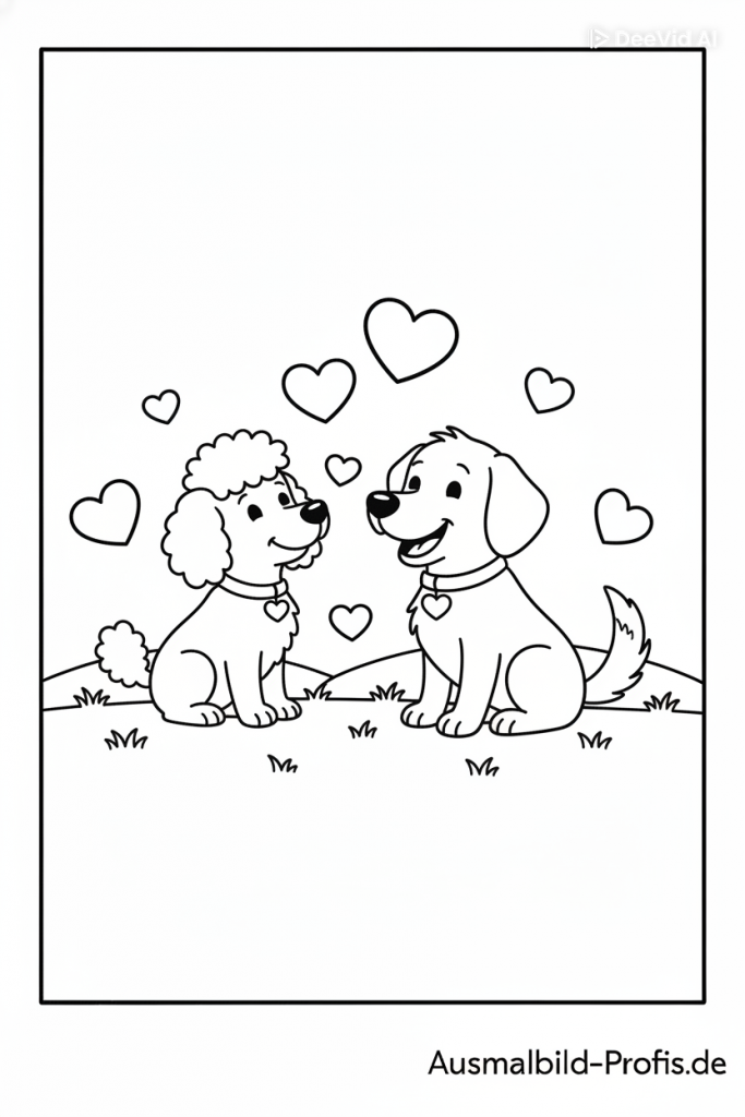 Ein lieber Hund sitzt fröhlich da, umgeben von vielen kleinen Herzen. Mit euren Lieblingsfarben könnt ihr sein Fell, die Herzen und die Umgebung bunt und fröhlich gestalten. Perfekt zum Ausmalen für alle Kinder, die Hunde, Liebe und süße Tiermotive mögen.