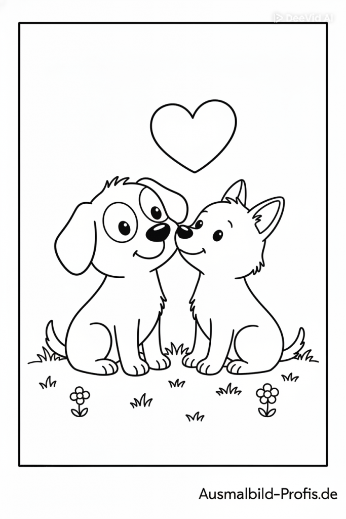 Zwei liebe Hunde zeigen ihre besondere Hundeliebe und kuscheln sich fröhlich aneinander. Mit euren Lieblingsfarben könnt ihr ihr Fell, kleine Herzen und die Umgebung bunt und fröhlich gestalten. Perfekt zum Ausmalen für alle Kinder, die Hunde, Freundschaft und liebevolle Tiergeschichten mögen.