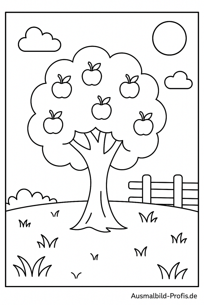Ein großer Apfelbaum steht auf einer Wiese und die Äpfel hängen nur so an seinen Zweigen. Mit euren Lieblingsfarben könnt ihr die Äpfel, die Blätter, den Baumstamm und die grüne Wiese bunt gestalten. Perfekt zum Ausmalen für alle Kinder, die Bäume, Obst und fröhliche Naturmotive lieben.