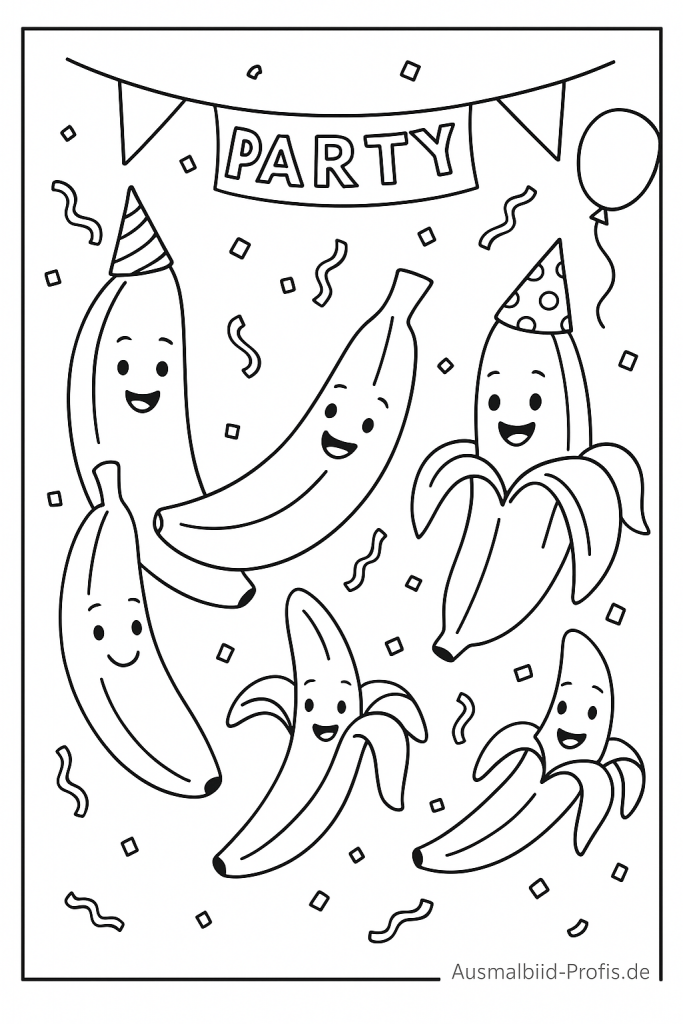 Viele lustige Bananen feiern gemeinsam eine fröhliche Bananen-Party. Mit euren Lieblingsfarben könnt ihr die Bananen, Konfetti, vielleicht Luftschlangen und andere Partydetails bunt gestalten. Perfekt zum Ausmalen für alle Kinder, die Obst, Partys und witzige Motive lieben.
