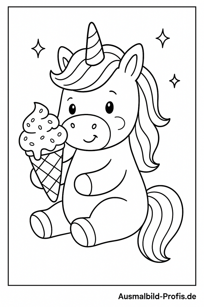 Ein fröhliches Einhorn genießt ein riesiges Eis und lässt sich die süße Leckerei in der Sonne schmecken. Mit euren buntesten Farben könnt ihr die Eiskugeln, die Waffel und seine zauberhafte Mähne herrlich knallig ausmalen.