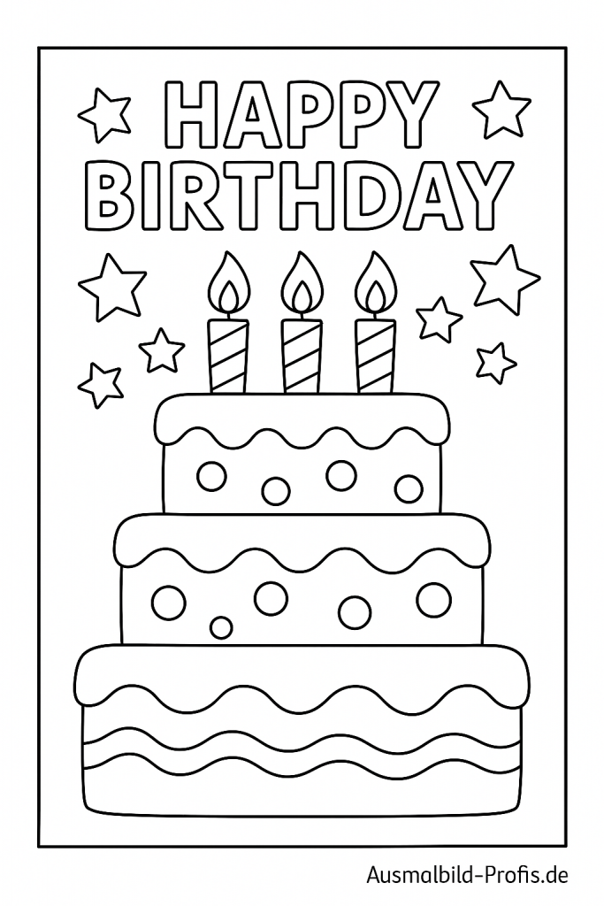 Eine große „Happy Birthday“-Torte mit Kerzen, Verzierungen und vielleicht ein paar Sternen oder Herzen wartet darauf, von euch bunt ausgemalt zu werden. Mit euren Farben könnt ihr die Tortenböden, die Glasur, die Kerzenflammen und jede Deko ganz nach euren Ideen gestalten. Perfekt zum Ausmalen für alle Kinder, die Geburtstage, Kuchen und fröhliche Feierbilder lieben.