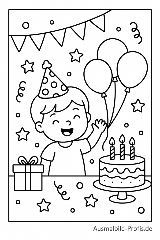 Ein fröhlicher Junge feiert seine Geburtstagsparty mit Luftballons, Geschenken und natürlich einem Geburtstagskuchen. Mit euren Farben könnt ihr seine Kleidung, die Deko, die Torte und den Partyraum kunterbunt gestalten. Perfekt zum Ausmalen für alle Kinder, die Geburtstage, Überraschungen und fröhliche Feiermomente lieben.
