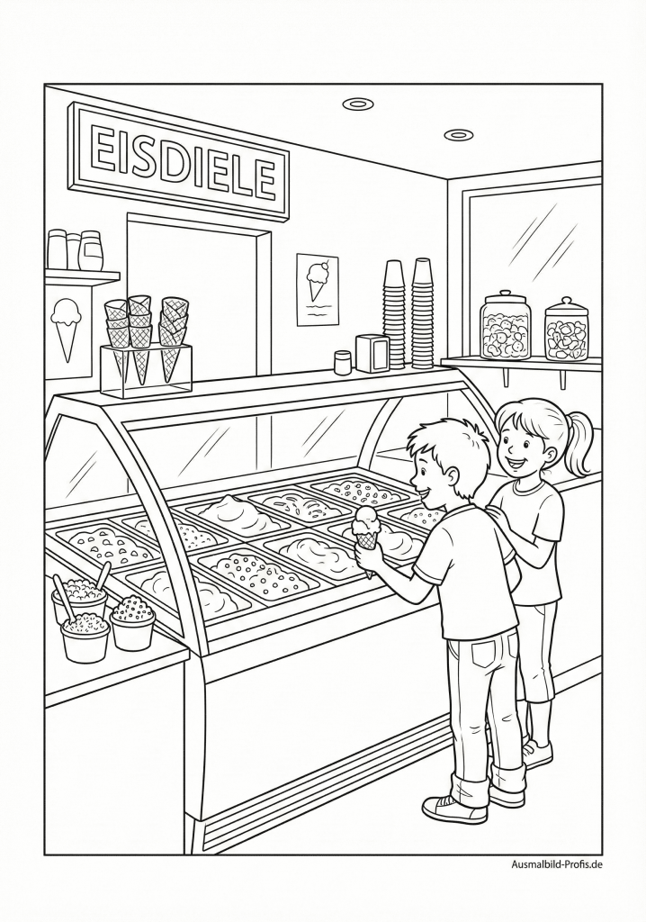 Mehrere Kinder stehen in einer Eisdiele vor der Theke und können sich kaum entscheiden, welche Sorte sie nehmen sollen. Mit euren Farben könnt ihr die vielen Eissorten in der Auslage, die Eistheke, die Kinder und den Laden fröhlich bunt gestalten. Perfekt zum Ausmalen für alle Kinder, die Eis lieben und von ihrem eigenen Besuch in der Eisdiele träumen.