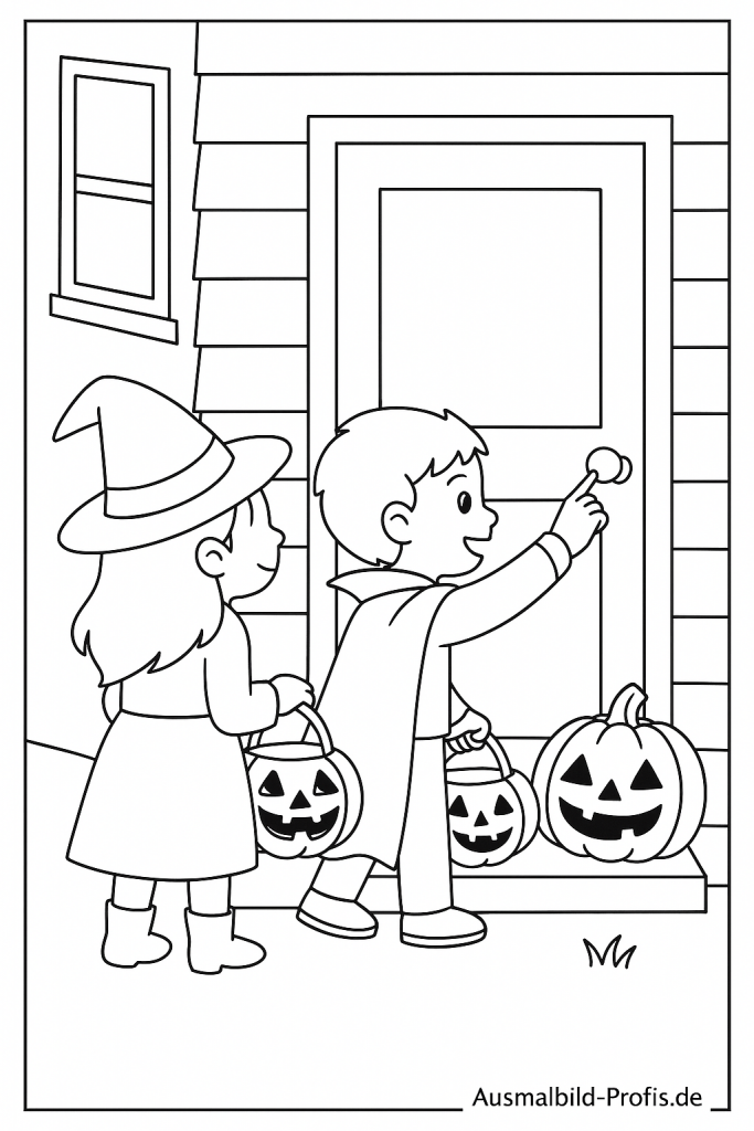 Mehrere verkleidete Kinder klingeln an der Haustür und hoffen auf viele süße Halloween-Leckereien – und warten darauf, von euch bunt ausgemalt zu werden. Mit euren Lieblingsfarben könnt ihr die Kostüme, die Kürbiseimer, das Haus und den Nachthimmel fröhlich oder ein bisschen gruselig gestalten. Perfekt zum Ausmalen für alle Kinder, die Halloween lieben und gerne lustige „Süßes-oder-Saures“-Szenen malen.