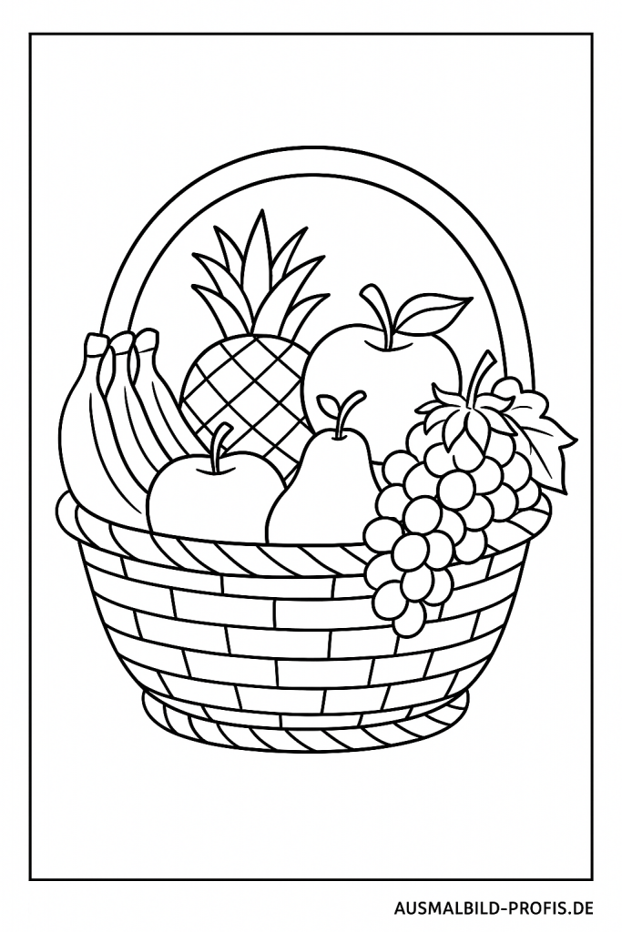 Ein prall gefüllter Obstkorb steckt voller leckerer Früchte wie Äpfel, Bananen, Trauben und mehr. Mit euren Lieblingsfarben könnt ihr jedes einzelne Obststück und den Korb selbst bunt und saftig aussehen lassen. Perfekt zum Ausmalen für alle Kinder, die Obst, gesunde Snacks und fröhliche Küchenmotive lieben.