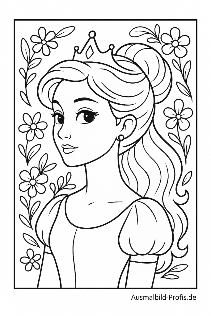Eine fröhliche Prinzessin hält einen hübschen Blumenstrauß in den Händen und steht inmitten vieler Blüten. Mit bunten Farben könnt ihr ihr wunderschönes Kleid, die Blumen und die kleine Märchenwelt um sie herum zum Leuchten bringen. Perfekt zum Ausmalen für alle Kinder, die Prinzessinnen, Blumen und zauberhafte Geschichten lieben.