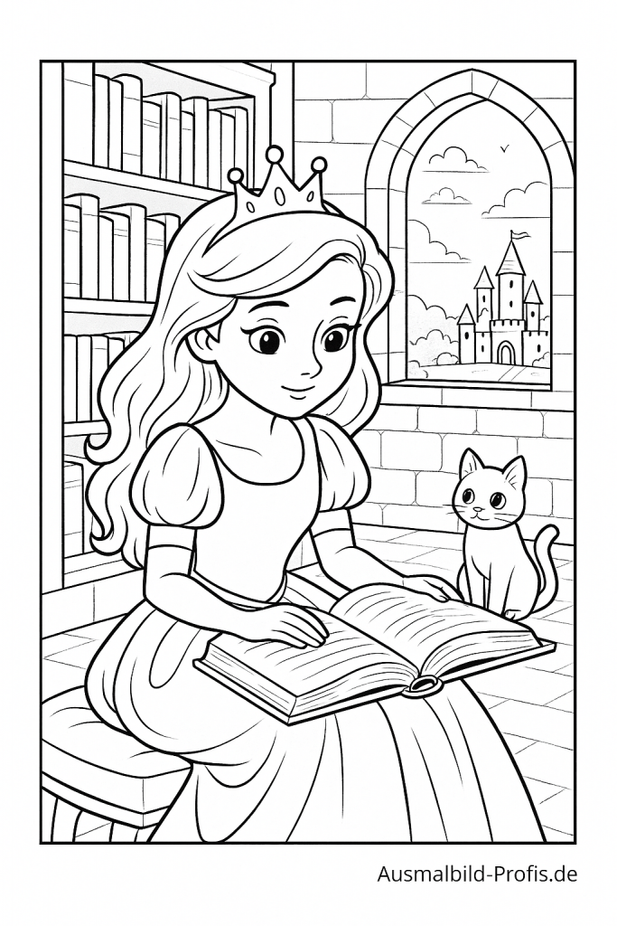 Eine gemütliche Prinzessin sitzt entspannt da und liest vertieft in einem spannenden Buch. Mit bunten Farben könnt ihr ihr schönes Kleid, das Buch und die Umgebung – vielleicht ein Schlosszimmer oder eine kuschelige Leseecke – kreativ gestalten. Perfekt zum Ausmalen für alle Kinder, die Prinzessinnen, Bücher und fantasievolle Geschichten lieben.