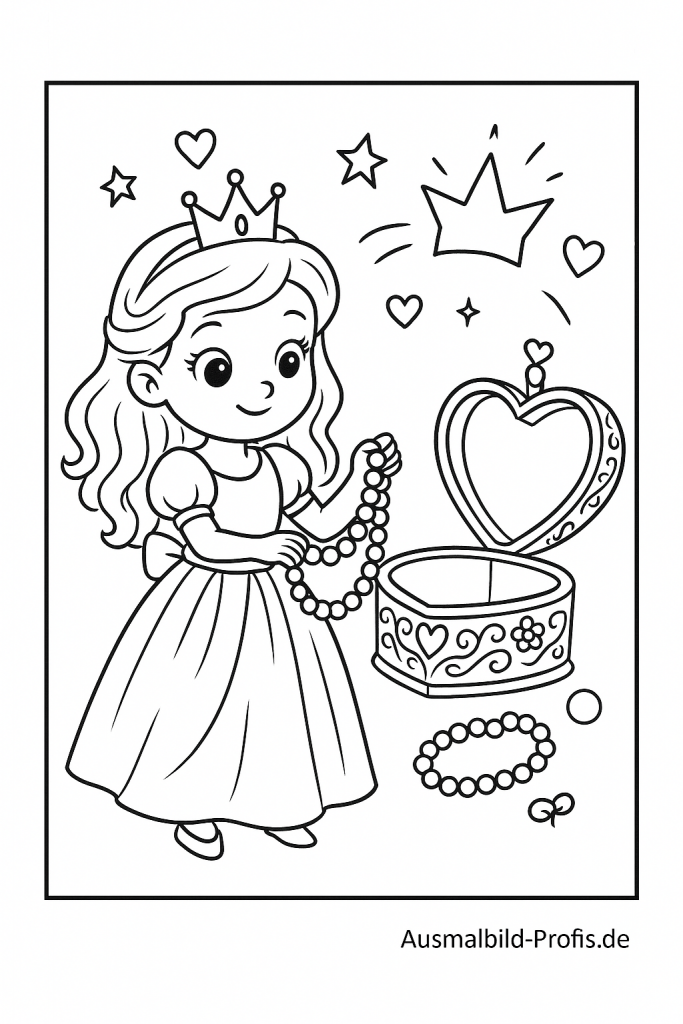 Eine elegante Prinzessin probiert ihren funkelnden Schmuck an und freut sich über Ketten, Ringe und glitzernde Kronen. Mit euren Lieblingsfarben könnt ihr die Schmuckstücke strahlen lassen und der Prinzessin einen ganz besonderen, königlichen Look geben.