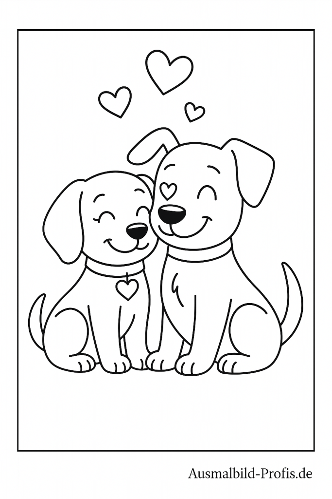 Zwei verliebte Hunde sitzen dicht beieinander und schauen sich ganz freundlich an. Mit bunten Farben könnt ihr ihr Fell, ihre Halsbänder und kleine Herzen oder eine süße Umgebung kreativ gestalten. Perfekt zum Ausmalen für alle Kinder, die Hunde, Freundschaft und liebevolle Tiergeschichten mögen.